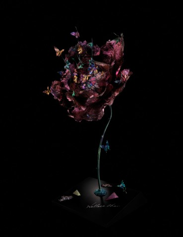 2.2米高的巨型牡丹花,花心鑲嵌著數千顆紅寶石、黃晶和紫晶,絢麗的色彩表現心花怒放的美態。牡丹花瓣中飛出數十隻蝴蝶,色彩繽紛,形態各異。花莖上是幾顆新發小蕾,流露蓄勢待發的生命力。底座上,除了土壤,為創作者對微塵世界的探索留下了一線懸念。