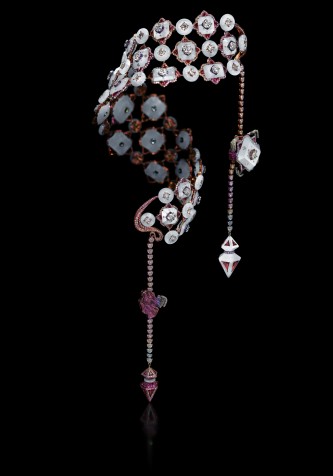 54顆光芒萬象的DIF足色全美鑽石,配以圓潤溫婉的白玉髓,間有溫柔喜人的粉紅碧璽,成就融典雅與高貴於一身的輕綾。作品以鈦金屬織成網狀骨幹,輕柔如絲,體現卓越工藝。