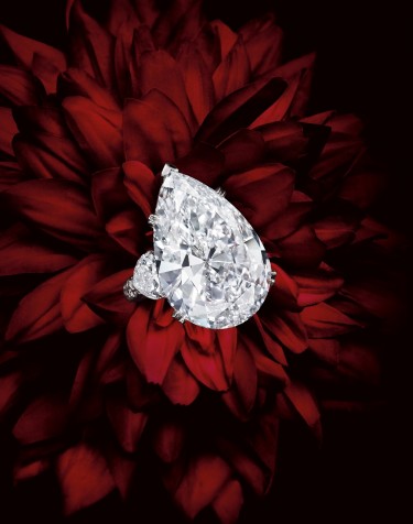 該顆梨形主石(圖一)份量十足,色澤及淨度均屬頂級,澄淨透亮,鑲嵌於鉑金指環上,兩邊各有一顆心形鑽石,戒托及戒圈上都鑲有單明亮切型鑽石。除主石外,其他鑽石共重4.45克拉。此鑽石指環估價為2,200萬至3,200萬港元(280萬至410萬美元)。